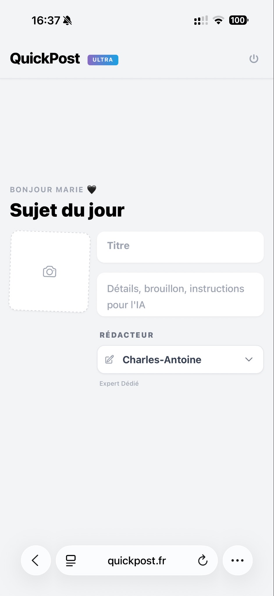 Découvrez QuickPost par CREA_LAB, la solution innovante qui réinvente votre stratégie de contenu. Fini le fardeau de la création : notre assistant sécurisé, véritable agence digitalisée, génère des designs professionnels et des textes optimisés en quelques secondes, même depuis votre mobile.